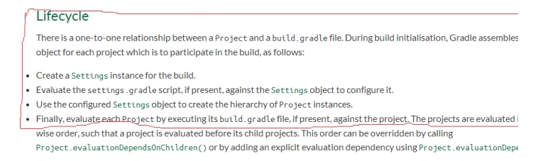 当我们执行 gradle 的时候,gradle 首先是按顺序解析各个 gradle 文件。这里边就有所所谓的生命周期的问题,即先解析谁,后解析谁。图 27 是 Gradle 文档中对生命周期的介绍:结合上一节的内容,相信大家都能看明白了。现在只需要看红框里的内容: