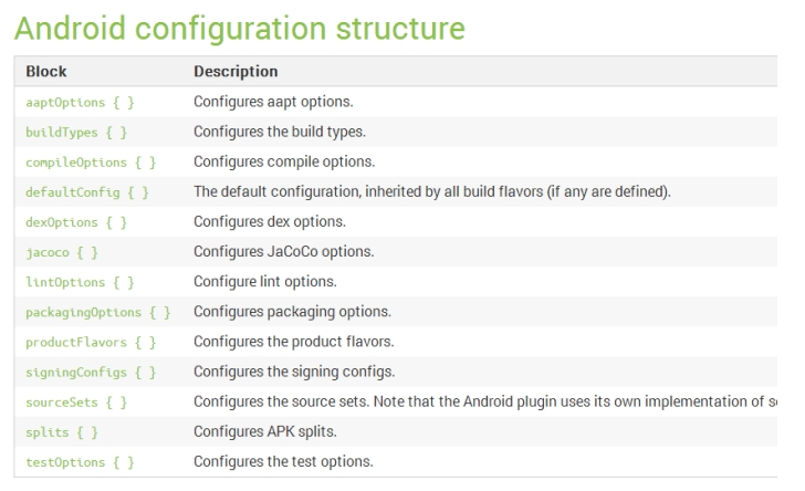 buildTypes 和上面的 signingConfigs,当我们在 build.gradle 中通过{}配置它的时候,