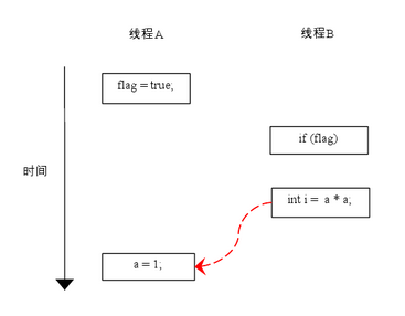 flag 变量是个标记,用来标识变量 a 是否已被写入。这里假设有两个线程 A 和 B,A 首先执行writer() 方法,随后 B 线程接着执行 reader() 方法。线程B在执行操作4时,能否看到线程 A 在操作1对共享变量 a 的写入?